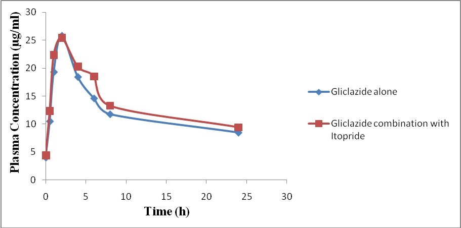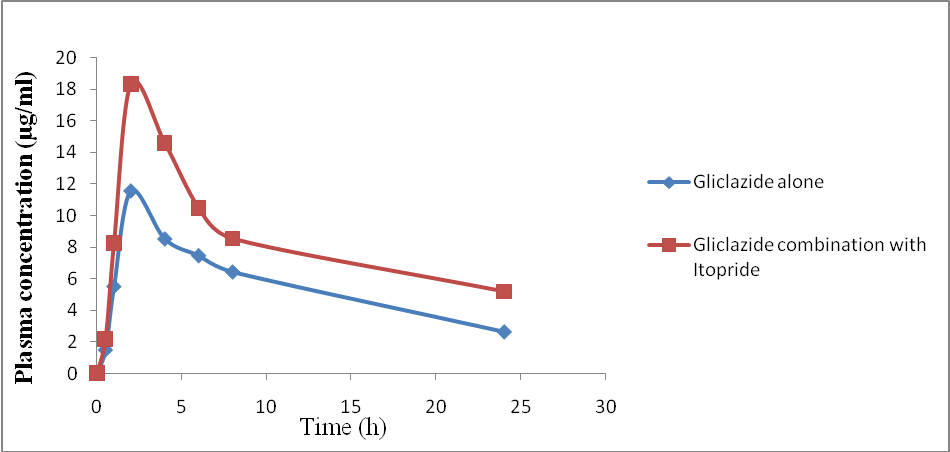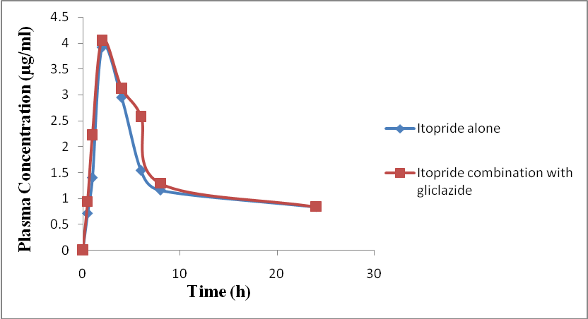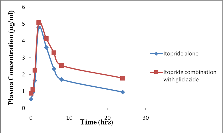 In the present study, Gliclazide is completely absorbed after oral administration with peak plasma concentration of 11.54±2.14mg/ml after 2 h of dosing on day 1. In combination with Gliclazide and Itopride on day 1, the peak plasma concentration of Gliclazide 18.33±0.12mg/ml occurred at 2hr after dosing. There was no significant increase in peak plasma concentration levels. Similarly Itopride is completely absorbed after oral administration with peak plasma concentration 3.92±0.03mg/ml occurred at 2hr after dosing on day 1 in combination with Gliclazide and Itopride on day 1.