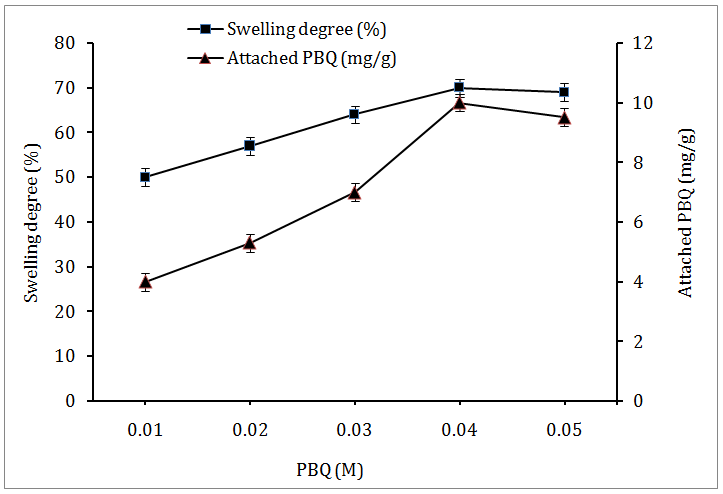 Fig. 4: Effect of variation p-benzoquinone (PBQ) concentration on the attached amount of PBQ and the swelling degree of the graftedPEC hydrogel. Activation conditions (2%ALG, 30 °C, 1h,pH10) at constant grafting conditions (0.2% CS for 3hr at 40 °C)