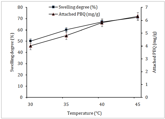 The effect of variation activation temperature on the attached amount of PBQ and the swelling degree of the grafted PEC hydrogel beads was shown in Fig.5. It was observed that with increasing the activation temperature from 30 °C to 45 °Cthe attached amount of PBQ and the swelling degree increased gradually. This behavior could be explained by an increase of the activation rate of the reaction due to decreasing the reaction medium viscosity, so the number of activated OH-groups increased and in turn the amount of covalently grafted NH2 of chitosan increased consequently. Furthermore, with using fixed amount of chitosan (0.2%), the probability of formation multi-attached covalent bonds with chitosan molecules leads to improvement of the three network structure of the formulated polyelectrolyte and enhance the swelling degree.