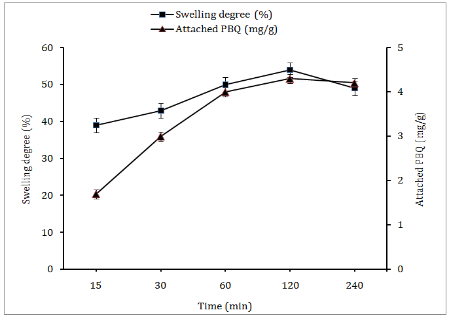 The effect of activation time was studied in the range 15 to 240 min as shown in Fig.6. It was observed that the attached amount of PBQ and the swelling degree of the grafted PEC beads were increased with increasing activation time up to 120 min. However, there is no effect on the attached amount of PBQ with increasing activation time beyond 120 min. these results can be attributed to that almost all of the available OH-groups in of alginate backbone were activated after 120 min, and so the amount of covalently grafted NH2 of chitosan chains also increases, thus, the swelling degree increased consequently.