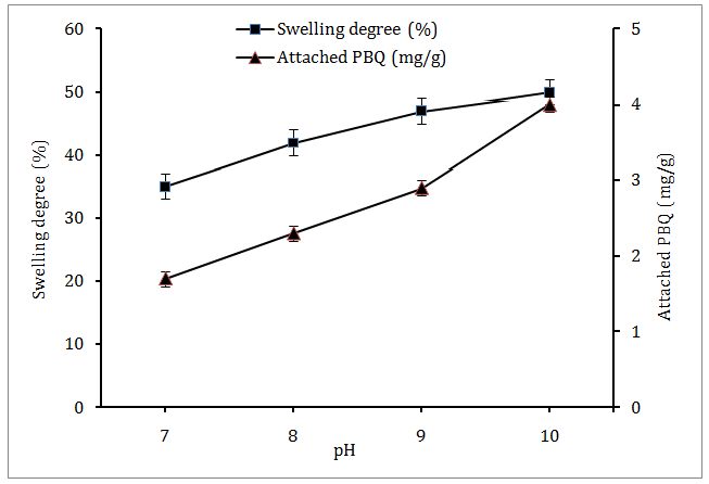 Fig. 7 show the effect of variation pH value of PBQ solution on the attached amount of PBQ and the swelling degree. It was observed that the two parameters were increased with increasing pH up to 10. These results can be explained by the fact that with increasing pH value up to 10 the rate of reaction between OH-groups of alginate and PBQ molecules increased, and consequently the amount of covalently grafted NH2 of chitosan.