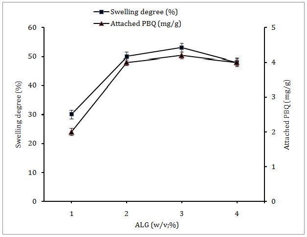 Fig. 8: Effect of variation alginate concentration on the attached amount of PBQ and the swelling degree of the grafted PEC hydrogelbeads. Activation conditions: (0.01M PBQ, 30 °C, 1h, pH10) at constant grafting conditions (0.2% CS for 3h at 40 °C)