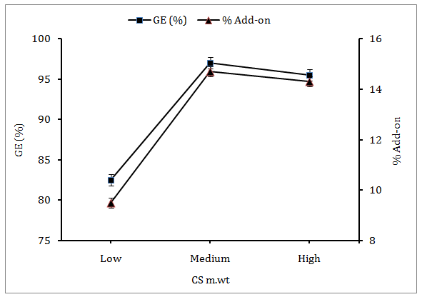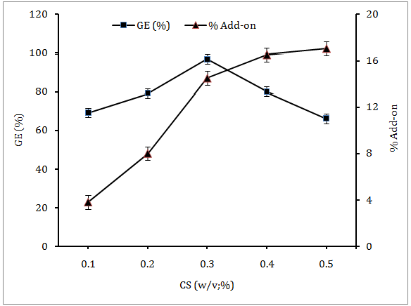 Fig.9 shows that increasing CS concentration clearly increased the percentage of grafting efficiency and % add-on. Maximum grafting efficiency (96.6%) and % add-on (14.5%) were obtained at 0.3% CS, and then the grafting efficiency tends to decrease with further increase of CS concentration beyond 0.3%. Also % add-on values were observed to be increased with small values (nearly stable). These observations may be attributed to that beyond0.3% CS the viscosity of the mixture increased, so, the movement of chitosan molecules decrease and the rate of chitosan diffusion into the formed polyelectrolyte complex also decreased, and then the grafting efficiency decreased consequently. On the other hand, % add-on values were nearly stable with increasing of CS above 0.3%; this may be attributed to the left numbers of activated OH groups of alginate were limited. Thus, further increase of CS was not effective. Higher concentrations of chitosan beyond 0.5% leads to more increasing in viscosity of the mixture, thereby hindering the formation of beads.
