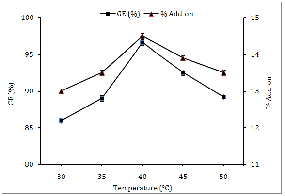 Fig. 10: Effect of variation grafting temperature on the grafting efficiency (GE %) and % polymer add-on. Activation conditions: (2%ALG, 0.04M PBQ, 45 °C, 2h, pH10) at constant grafting conditions (0.3%CS for 3h)