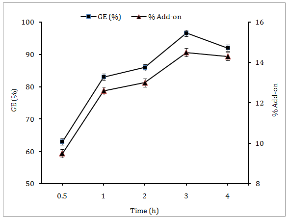 Fig. 11: Effect of variation grafting time on the grafting efficiency (GE %) and % polymer add-on. Activation conditions: (2%ALG, 0.04M PBQ, 45 °C, 2h, pH10) at constant grafting conditions (0.3%CS at 40 °C)