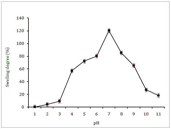 The swelling studies were conducted using wet beads. Pre weighed grafted hydrogel beads (1g) were immersed in the swelling medium solution at 37oC using HCL-KCL, Citrate-Phosphate and saline phosphate buffer solutions with different pHs in the range (1.0-10) and allowed to swell for 6h. Finally; the swollen beads were taken out and pressed gently in between two filter papers to remove liquid adhering to the surface, immediately followed by weighing on an electronic balance. All swelling experiments were performed in triplicate and the mean values are reported.