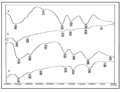 Fig. 14: FTIR of (a) ALG, (b) ALG-PBQ, (c) CS and (d) CS-g-ALGbeads