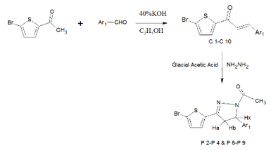 Claisen-Schmidt condensation reaction between 2-acetyl-5-bromothiophene and different substituted aldehydes catalysed by 40% KOH gave chalcones (C2-C10). The obtained chalcones were cyclised in the presence of glacial acetic acid to give 2-pyrazoliones (P2-P4 & P7-P9) (Scheme-I). All the synthesized compounds were characterized by FT IR, 1NMR and mass spectroscopic data.