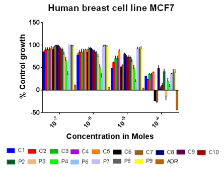 The effect of synthesized compounds on cell growth was determined on two human tumor cells MCF-7 & MDA-MB-468. The sulforhodamine B (SRB) assay is used for cell density determination, based on the measurement of cellular protein content. The method described here has been optimized for the toxicity screening of compounds to adherent cells in a 96-well format. After an incubation period, cell monolayers are fixed with 10% (Wt/Vol) trichloroacetic acid and stained for 30 min with 0.4% (Wt/Vol) SRB dissolved in 1% acetic acid after which the excess dye was removed by repeatedly washing with 1% (Vol/Vol) acetic acid. The protein-bound dye was dissolved in 10 mM tris base solution for OD determination at 564 nm using a microplate reader.