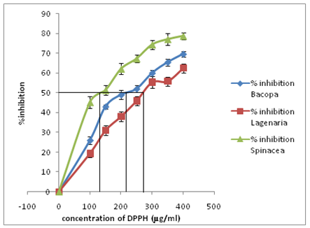 The scavenging effects of extract increased with increasing concentrations. The percentage inhibition of concentration 100, 200, 300, 400 μg/ml was about 26, 49, 60, 69.61 % for Bacopa;19.37, 38.03, 55.37, 62.45 % for Lagenaria; 45.23, 62.14. 74.42, 78.79 % for Spinacia respectively (fig. 1).
