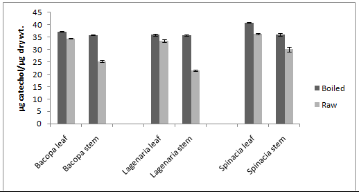 In all the three vegetables amount of total phenol was higher in leaf than stem (fig. 2). Boiled leaves of Spinacia, Bacopa and Lagenaria were found to contain 40.86, 37.26 and 36 µg catechol/µg dry weight respectively which was slightly more than the phenol content in raw leaves of Spinacia (36.33 µg catechol/µg dry weight), Bacopa (34.46 µg catechol/µg dry weight) and Lagenaria (33.53 µg catechol/µg dry weight).