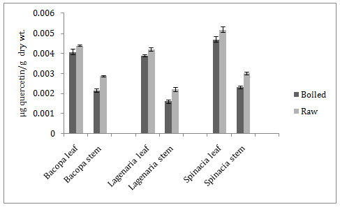 Flavonoid content of methanolic extracts of raw leaf samples ranged from 0.0052 μg quercetin/g dry wt. in Spinacia to 0.0042 μg quercetin/g dry wt in Lagenaria (fig. 3). Flavonoid content of methanolic extracts of boiled leaf decreased by 9.6% in Spinacia to 7.1% in Lagenaria.
