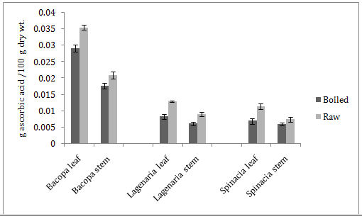In all the tested samples vitamin C content of leaves was relatively greater than stem in both raw and cooked form. Bacopa leaves contain higher amount of vitamin C (0.035 g/100 g sample) followed by Lagenaria (0.012 g/100 g sample) and Spinacia. (0.0113 g/100 g sample). Boiling significantly decreased the vitamin C content by 18%, 35.6% and 39.4% in leaves of Bacopa, Lagenaria and Spinacia respectively (fig. 4).