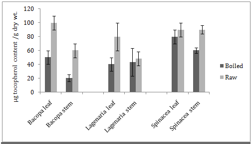 In all the three samples leaves contain relatively more vitamin E than stem of the same plant. Tocopherol content diminishes in the boiled samples, 10 % in Lagenaria stem to 66 % in Bacopa stem. Regarding boiled leaf samples, the decrease of 11 % in the case of Spinacia leaf to 50 % in case of Bacopa and Lagenaria leaf is observed (fig. 5).
