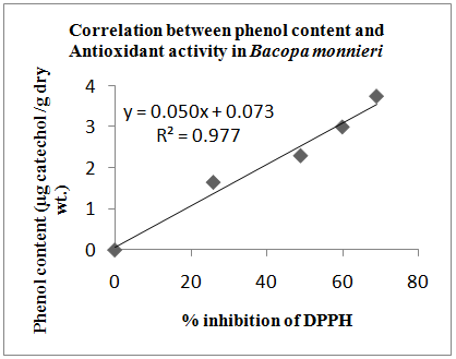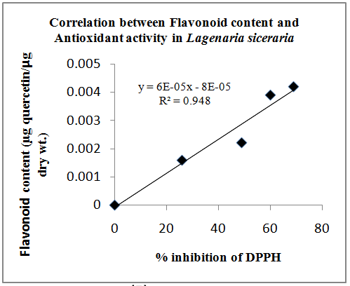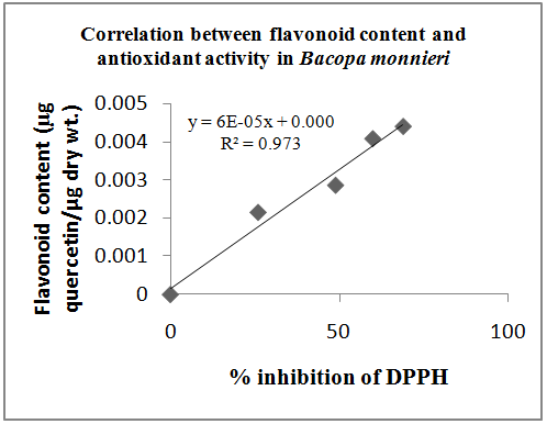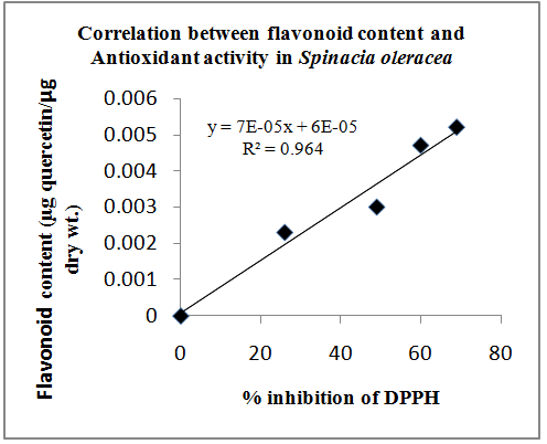 Similar positive correlation are also found between antioxidant activity and flavonoid content, R² = 0.973, R² = 0.948 and R² = 0.964, for Bacopa, Lagenaria and Spinacia leaf respectively (fig. 6). Vitamin C is a naturally occurring antioxidant found in different plant products. Vitamin C can donate a hydrogen atom to a free radical molecule thereby neutralizing it, while becoming an ascorbate radical itself. In our study, high amount of vitamin C are noted in the leaves of studied vegetables both in raw and boiled condition. According to our observation, the amount of vitamin C is high in Bacopa in both raw and cooked form than Lagenaria and Spinacia (fig. 4). Our finding is in agreement with the previous report by Meena et al. [34]. Porter [29], reported that boiling for 5 min led to a considerable loss of vitamin C in green and purple broccoli. Same trend of results is also observed in our study. Vitamin C is highly water-soluble, so cooking in water may cause leaching of this vitamin into surrounding water. But no significant effect of steaming on the vitamin C content is reported by Yuan et al. [35]. Vitamin E is the important hydrophobic chain breaking antioxidant that protects membrane and plasma lipoprotein from free radicals [36]. A considerable good amount of vitamin E was reported by Chun et al. [37] in several vegetables. In our study the presence of high amount of tocopherol in Bacopa leaf makes it a good source of natural antioxidants (fig. 5).