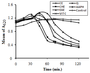 Fig.3: Representative tracings showing changes in turbidity (OD at 620 nm) of RBC samples in response to AAPH following incubation with CE, CHE, EAE, Quercetine (Q) and Ascorbic acid (VIT C). Recording started immediately following the addition of AAPH.Each value is represented as mean of numbers of triplicates±SD (n = 3)