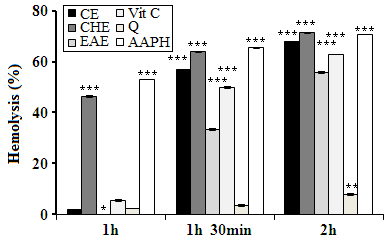 Fig.4:Percentage of hemolysis of RBCs with 0.1 mg/ml of D. gnidium extracts (CE, CHE, EAE), Quercetine (Q) and Ascorbic acid (VIT C). Each value is represented as mean±S. D (n = 3). (***p ≤0.001;**p ≤0.01; *p ≤0.05)