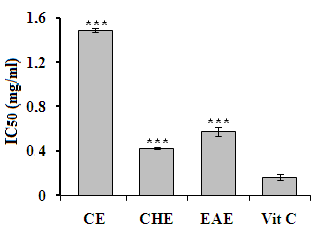 Fig.5:DPPH radical scavenging activity of different DGEextracts; crud extract (CE) ethyl acetate (EAE), chloroform (CHE), rutine (Rut), quercetine (Q) and gallic acid (Gal A). Data are presented as IC50 values. Each value represents the mean±SD (n = 3). (***p ≤0.001; compared to Gal A)