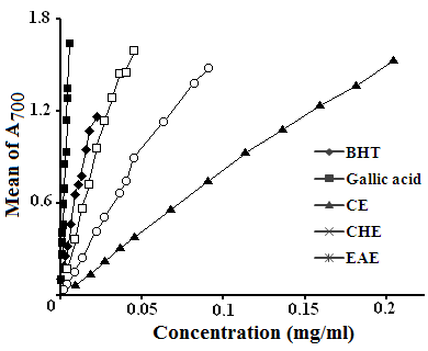 The reducing ability of the extracts from D. gnidium, BHT and gallic acid were measured according to the method described by [32] with some modifications. A 0.1 ml aliquot of each extract, BHT or gallic acid was mixed with an equal volume of 0.2 M phosphate buffer (pH 6.6) and 1% potassium ferricyanide, and then incubated at 50 °C for 20 min. 0.25 ml of 10 % trichloroacetic acid was added to the mixture to stop the reaction, then the mixture was centrifuged at 3000g for 10 min. The supernatant (0.25 ml) was mixed with 0.25 ml distilled water and 0.1% FeCl3 (0.5 ml) and then the absorbance was measured at 700 nm. The reducing power of the test samples was increased with the absorbance values.