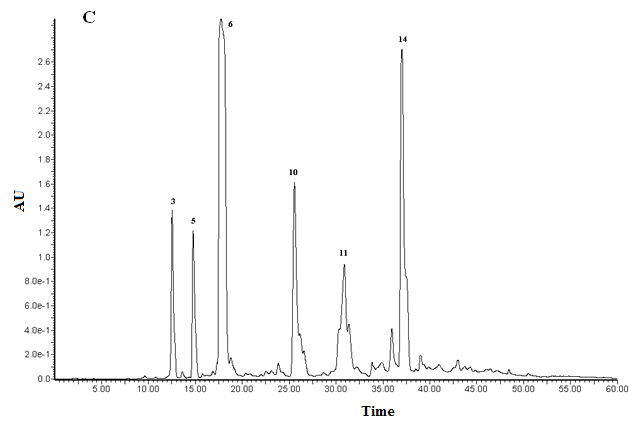 Fig. 8: LC/Uv-vis-DADchromatograms of D. gnidium extracts visualised at 330 nm A: methanol extract; B: ethyl acetate extract C: chloroform extract