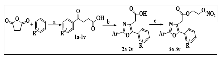 The synthesis of target compounds 3a-3v is shown in scheme 1-2.Succinic anhydride was reacted with substituted benzene in the presence of aluminium chloride to afford substituted benzoyl propionic acid (1a-1v). Nitro-oxy ethyl bromide was prepared from bromoethanol in the presence of nitric acid and sulfuric acid. Substituted benzoyl propionic acid was reacted with substituted benzyl amines in the presence of TBHP, copper acetate, iodine and dimethyl formamide to give 2-(substituted-2,5-diphenyl-oxazole)-acetic acid (2a-2v). The target compounds were obtained by reacting 2-(substituted-2,5-diphenyl-oxazole)-acetic acid with nitro-oxy ethyl bromide in the presence of dimethyl formamide and potassium carbonate to give2-(nitrooxy)-ethyl-2-(substituted-2,5-diphenyl-oxazole)acetate derivatives (3a-3v, table 1). The structures of various synthesized compounds were assigned on the basis of results of different chromatographic and spectral studies. The physical data, FTIR, 1H-NMR, mass spectral data and elemental analysis data for all the synthesized compounds are given in experimental protocols.
