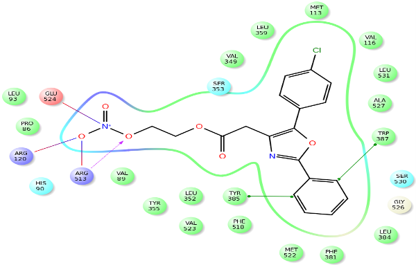 Methods: The compounds were designed with the help of docking studies. In the synthetic study the target compounds were obtained by reacting 2-(substituted-2,5-diphenyl-oxazole)-acetic acid (2a-2v) with nitro-oxy ethyl bromide in the presence of dimethyl formamide and potassium carbonate to give 2-(nitrooxy) ethyl 2-(substituted-2,5-diphenyl-oxazole) acetate derivatives (3a-3v). The synthesized derivatives were characterized with the help of different analytical techniques and further evaluated for anti-inflammatory, analgesic and nitric oxide releasing activity.