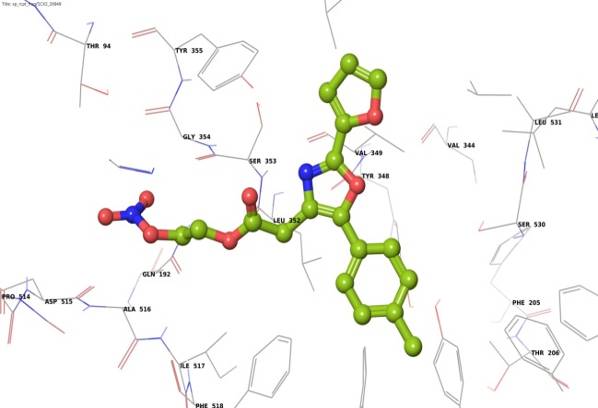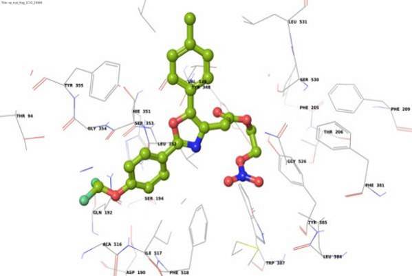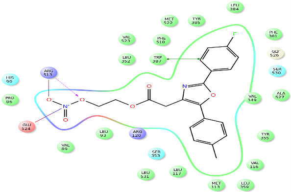 The phenyl ring with F or CH3 groups at Ar position helps the oxazole derivatives to form the hydrophobic contacts with surrounding hydrophobic amino acids. The phenyl ring with F or CH3 groups also supports aliphatic side chain at C5 position or forming an H-bond with surrounding amino acids. Thus, the replacement of these hydrophobic substituents by other aryl ring substituents and hetero ring showed the decreased binding affinity toward COX-2 enzyme and G-score (fig 4 and fig 5). Table 5 also clearly suggests that the replacement of hydrophobic substitution by hetero ring or phenyl ring with an electron withdrawing group at Ar position showed decrease in hydrophobic enclosure reward as well as lipophilic Vander Waal interaction and ultimately affect binding pose of compounds and reduces the G-score. These F or CH3 substituted phenyl ring in an above compound is surrounded by common hydrophobic amino acids Val 523, Phe 381, Leu 352, Ala 527, Phe 518, Leu 384, Tyr 385 and Met 522.