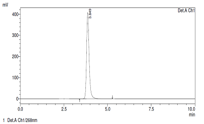 The HPLC method was optimized with a view to develop an assay method for darunavir ethanolate. Initially, different columns, different combinations of mobile phases such as methanol: water and Acetonitrile: Potassium Acetate in different proportions, were tried at different flow rates. Finally, A mobile phase consisting acetonitrile and 0.01M potassium acetate buffer, pH 5.1 (75:25 v/v) at the flow rate 1 ml/min was selected. The injection volume was 20 µl. The analysis was performed at an ambient temperature with UV detection at 268 nm. The Chromatogram of darunavir ethanolate is shown in fig. 3 and the optimized chromatographical conditions are mentioned in table 1. The retention time of the drug is 3.85 min under optimized chromatographical conditions.