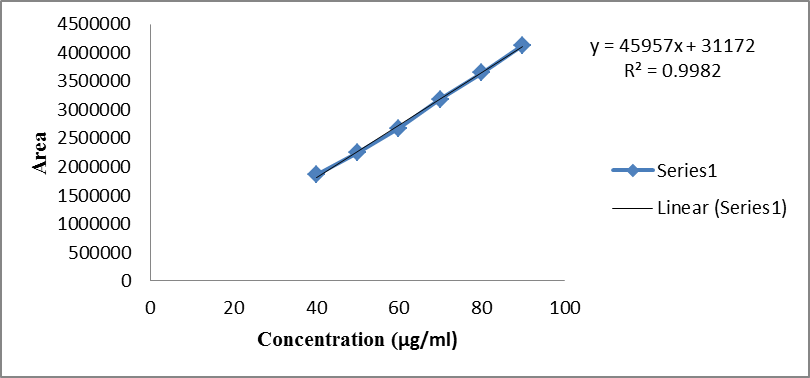 The value of R2 is found to be 0.9982, which indicates that the calibration curve is linear in the concentration range of 40-90 μg/ml.