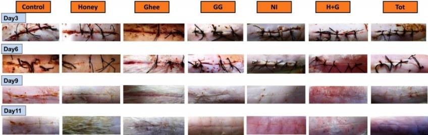Wistar rats were used for incision wound model. The animals were classified into 7 groups (6 animals in each group): Control (untreated), Honey, Ghee, GG, NI, Honey+Ghee (H+G), combination of all test materials (Tot).
