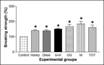 Among the experimental groups, NI showed significantly high breaking strength among the all tested group (p<0.05) which was followed by the GG, TOT, H+G, Honey and Ghee treated groups.
