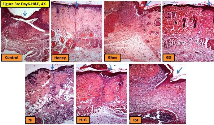 Rapid epithelialization was observed in all the treated groups compared to the control group on the day 6 of wound healing (fig. 3a and 4a). Additionally the anchoring of the dermis to the epidermis was nearly complete and clearly observed in all the treated groups compared to control.