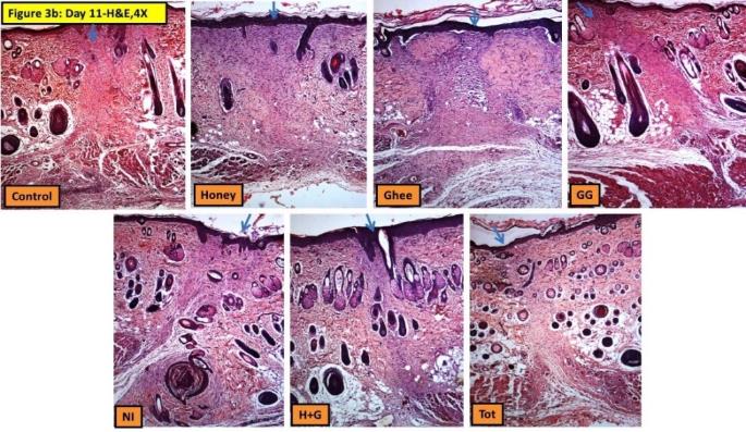 This indicates the faster wound healing effect of all the test materials singly or in combination. Among all the treated groups, Honey and GG treated animals showed better epithelialization and dermal anchorage to the epidermis. However, by day 11 healing and tissue remodeling were similar in all the test groups (fig. 3b and 4b).