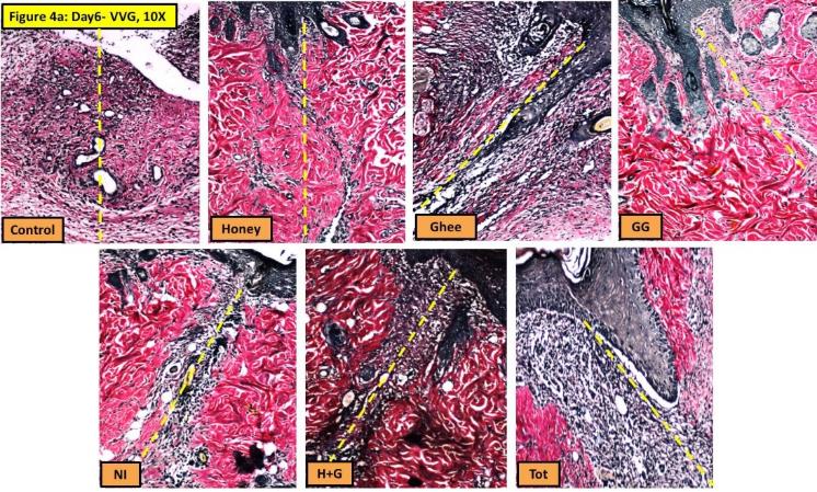 Fig. 4a: Verhoeff’s van Geison stain stained sections on 6th day of treatment at 10X magnification showing the area of healing at the site of incision. The area of healing is identified by the differential staining of the dermis at the wound site. Healing area either shows a light stain due to the regenerating collagen fibers as seen in Honey, GG and NI treated groups or black stain by the rich reticular fibers and blood vessels as in Ghee, H+G and Tot groups. All the treated groups showed better healing compared to control. Yellow dotted line indicates the site of incision