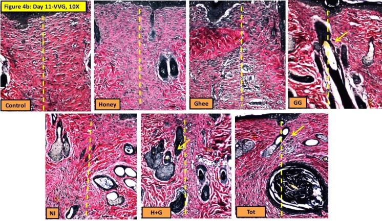 Fig. 4b: Day 11, Verhoeff’s van Geison (VVG) stain, 10X magnification showing the area of healing at the site of incision. The healing area shows less fibrosis and better collagen rearrangement in all the treated groups. Skin appendages like the hair follicles are also observed in the groups treated with GG, H+G and Tot (Indicated by arrow). Ghee continues to show increased vascularity. Yellow dotted line indicates the site of incision