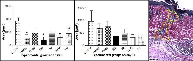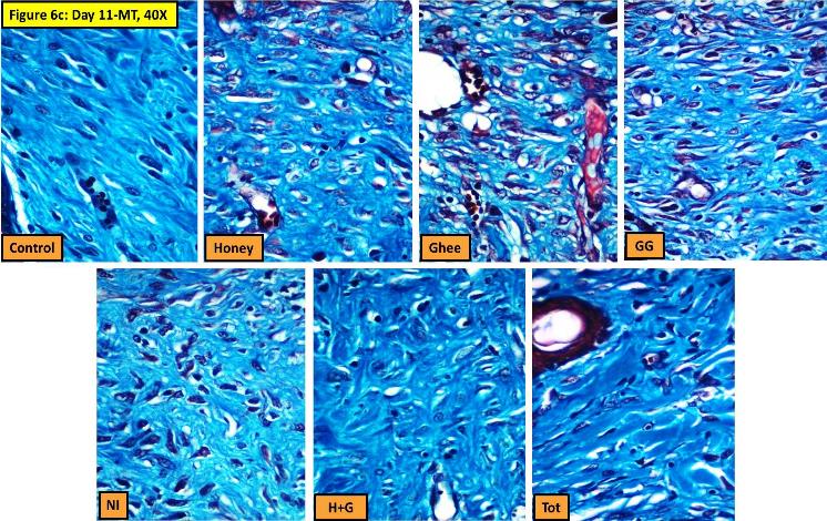 The images of the stained slides when subjected to quantification using image analyzer software also showed promising results in the test groups compared to the control group. Area of the wound healing was marked and measured on the basis of the differential staining using Verhoeff’s van-Geison stain. The results were represented graphically (Fig.5). Better healing was indicated by the wounds of all treated groups compared to control. Honey, GG, H+G and Tot showed significant reduction in the area of healing compared to control on day 6. Ghee and NI although showed a decrease but was not significant statistically. By day 11, all the groups showed better and enhanced healing and there was no significant difference when compared to control.