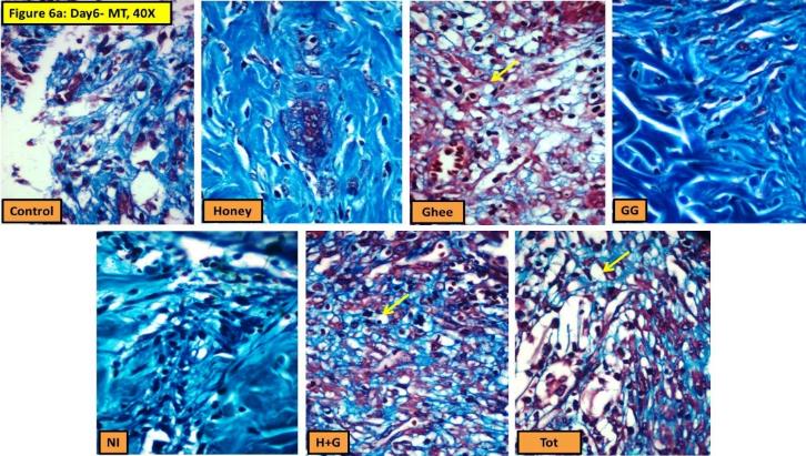 Fig. 6a: Day 6, Masson’s trichrome stain (MT) stain, 40X magnification showing the increased vascularity in the groups treated with Ghee, H+G and Tot which is identified by the presence of blood vessels (vacuolated spaces-yellow arrow) in comparison to the control group