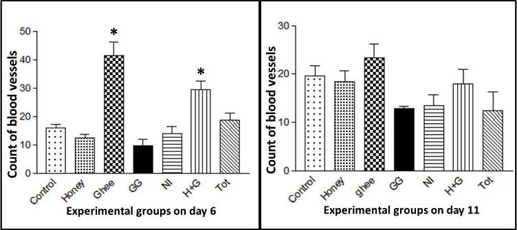Fig. 6b: Graphical representation of the blood vessel count at the wound site in different treatment groups on day 6 and day 11. *p<0.05 vs control