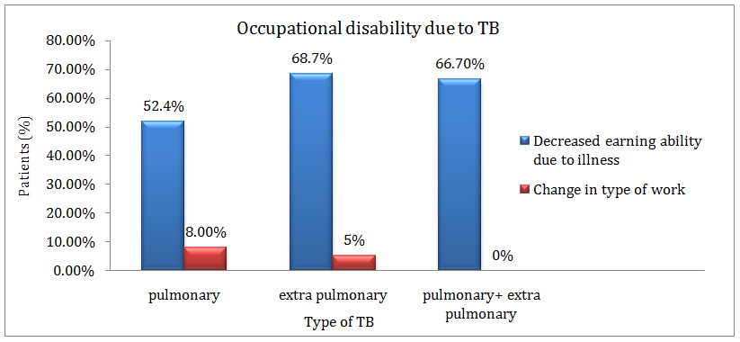 The employed patients of pulmonary were 21 patients; 16 with extra-pulmonary and 3 with pulmonary and extra-pulmonary. The earning ability of pulmonary tuberculosis, extra-pulmonary tuberculosis and pulmonary and extra-pulmonary was 52.4 %, 68.7 % and 66.7 % respectively.