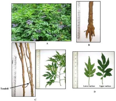 The stem (fig. 1C) is herbaceous, sometimes hollow, branched, and nearly cylindrical in shape and up to 1 cm in diameter. The young branches usually being green having violet tinge and being thinner and climbing with tendril where the lower part of the main stem and the older branches are pale brown in color.
