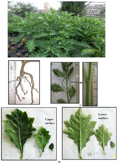 Fig. 2: Photographs of aerial parts, root, stem and leaves of Solanum macrocarpon (A) Aerial parts in the flowering stage (X=0.15), (B) Root (X=0.31), (C) Stem (X=0.13), (D) upper and lower surface of leaf (X=0.46)