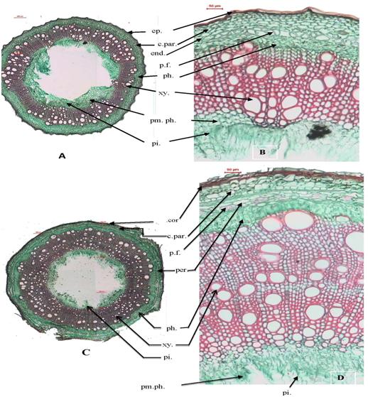 Fig. 4: Micromorphology of S. seaforthianum stem (A) Low power view of young stem T. S. (X=25), (B) High power view of young stem T. S. (X=140), (C) Low power view of old stem T. S. (X=25), (B) High power view of old stem T. S. (X=150). cor., cork; c. par., cortical parenchyma; end., endodermis; ep., epidermis; p. f., pericyclic fibre; pm. ph., perimedullary phloem: ph., phloem; pi., pith; xy., xylem. High power view (X=100)