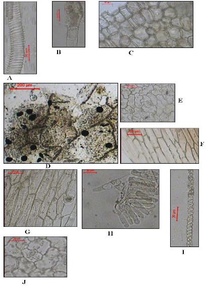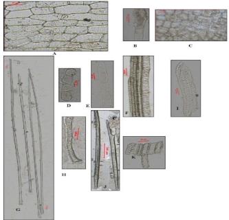 Fig. 5: Powdered stem of Solanum seaforthianum, A., epidermis (X=220); B., clavate glandular trichome (X=400); C., cork(X=200); D., cortical parenchyma (X=116.6); E., medullary ray (X=100); F., reticulate xylem vessel (X=233); G., pericylicfibre (X=80); H., spiral xylem vessel (X=550); I., tracheids (X=233); J., wood fibre (X=75); K., wood parenchyma (X=267)