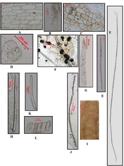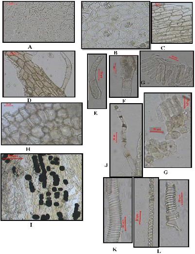 Fig. 7: Powdered leaf of Solanum seaforthianum, A., upper epidermis (X=375); B., lower epidermis (X=700); C., neural epidermis (X=100); D., epidermis of the petiole (X=450); E., non-glandular trichome (X=300); F., clavate glandular trichome (X=450); G., spongy tissue and palisade (X=300); H., cortical parenchyma (X=200); J., glandular trichome (X=267); I., idioblast (X=70); K., annular vessel (X=367); L., spiral vessel (X=333)