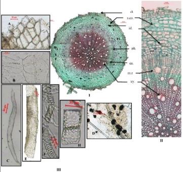 Transverse section of Solanum seaforthianum root (fig. 3, I and II) is more or less circular in outline. Covered with outer brown cork layer consists of several rows of brown radially arranged and tangentially elongated polygonal cells, having either suberized or slightly lignified walls. The phellogen consists of 1-2 rows of tangentially elongated cells having thin cellulosic walls. Secondary cortex appeared as several layers of thin walled parenchyma followed by parenchymatous pericycle. Vascular tissue is formed of central large xylem region representing half of the section. It consists of lignified xylem vessels, wood parenchyma, tracheids and wood fibres, followed to outside by cambium layers (4-6 rows) then phloem region. Vascular tissue is traversed by biseriate to multiseriate lignified medullary rays. Numerous idioblasts containing microcrystals of calcium oxalate found in phloem, pericycle and cortical tissues. Scattered parenchyma tissues also contain starch granules (blue with iodine T. S.).