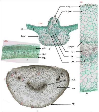 Fig. 6: Micromorphology of Solanum seaforthianum leaf. (A) Low power view of leaf T. S. (X=35), (B) High power view of the midrib region in leaf T. S. (X=120), (C) High power view of the lamina region of leaf T. S.(X=160), (D) Petiole T. S. (X=80), c. par., cortical parenchyma; cor., cortex; ep., epidermis; id., idioblast; l. ep., lower epidermis; n. gl. t., non-glandular trichomes; pal. t., palisade tissue; ph., phloem; pm. ph., perimedullary phloem; sp. t., spongy tissue; tri., trichomes; u. ep., upper epidermis; v. b., vascular bundle
