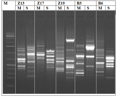 Ten primers, purchased from Operon Technologies Inc. (Almeda, California, USA), were used for Random Amplified Polymorphic DNA (RAPD) analysis, with the following sequences: B15: 5’-GGAGGGTGTT-3’, B16:5’-TTTGCCCGGA-3’, A9:5’-GGGTAACGCC-3’, A20:5’-GTTGCGATCC-3’, O14:5’-AGCATGGCTC-3’, M5:5’-GGGAACGTGT-3’, Z13:5’-GACTAAGCCC-3’, Z17:5’-CCTTCCCACT-3’, Z19:5’-GTGCGAGCAA-3’ and B3: 5’-CATCCCCCTC-3’.
