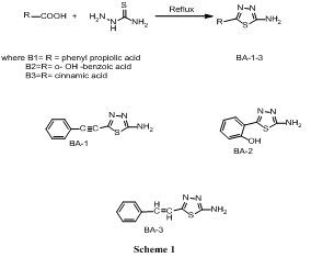 Substituted amino thiadiazoles were prepared by the conventional method as outlined in Scheme 1. A mixture of carboxylic acid (phenyl propiolic/o-OH-benzoic/cinnamic acid, 0.01 moles, in separate reactions) and thiosemicarbazide (0.012 mole) was mixed thoroughly. The reaction mixture was heated under reflux (Scheme 1) in the presence of only conc. H2SO4 without any solvent for 6-8 h [13]. The reaction mixture was cooled to room temperature and neutralized with ammonia solution. The solid were filtered and washed with water followed by few drops of ether. The products were re-crystallized from ethanol and characterized by various spectral methods.