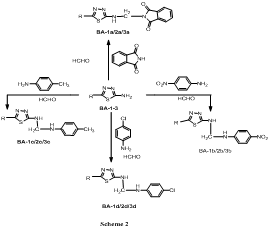 A methanolic solution of BA-1/BA-2/BA-3 (0.01 mol) was taken (in separate reaction) in a round bottom flask equipped with a stirred and dropping funnel. The solution was stirred to dissolve it completely. To this methanolic solution of formaldehyde (3.0 ml) was added drop wise during 15-20 min. The resulting mixture was stirred during half an hour to complete the reaction. To this reaction mixture the methanolic solution of phthalimide/p-NO2/p-CH3/p-Cl aniline (0.01 mol) was added drop wise with stirring in about half an hour at 30 °C temperature and refluxed for 2 h at 65-75 °C (Scheme-2). It was allowed to cool and poured in cold water. The solid obtained was filtered off washed thoroughly with hot water and air dried. All products were characterized by IR, NMR and were found consistent with an expected structure as shown in table 1.