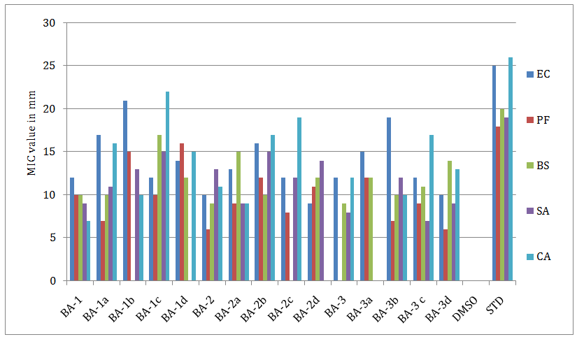 All synthesized and characterized compounds (1–15) were evaluated for their antibacterial activity against gram positivebacteria-Bacillus subtilis, Staphylococcus aureus and gram negative bacteria Escherichia coli, Pseudomonas aeruginosa together with a fungus Candida albicans using well diffusion method,and compared with well‑known antibacterial/antifungal drug, Ciprofloxacin/ ketaconazole. The minimum inhibitory concentration (MIC, 10μg ml-1) was determined for each compound in triplicate experiments. The values were averaged and reported in table 2 while graphically shown in fig. 1.